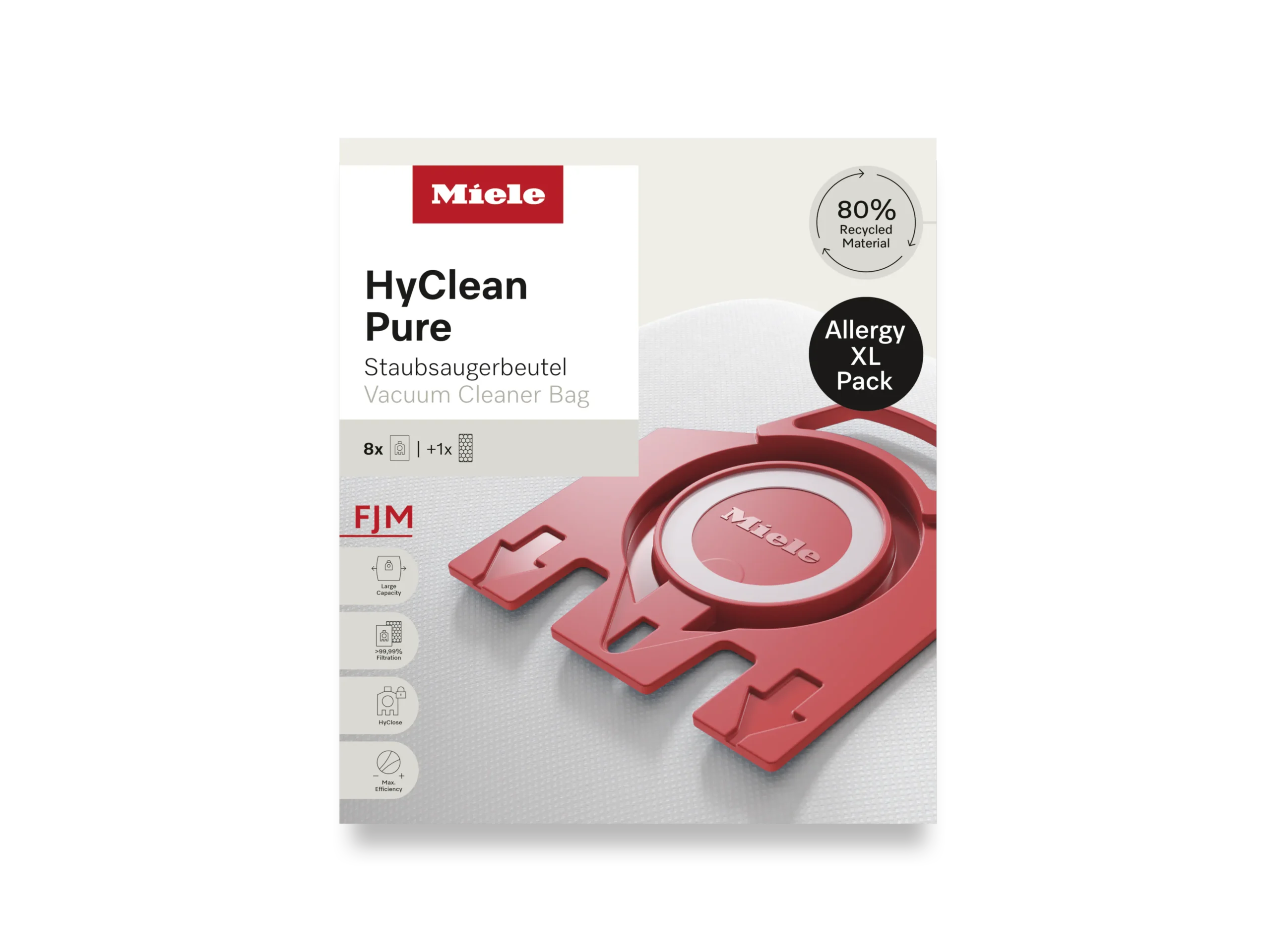 Filtračný systém Miele AirClean, zložený z prachového vrecka HyClean Pure a výstupného filtra Miele, zaručuje vysokú úroveň hygieny. Výrazne znižuje množstvo jemného prachu vo vzduchu, čo vám umožní voľne dýchať a ušetrí čas s námahou. Spolupráca komponentov filtruje viac ako 99,99 % jemného prachu.